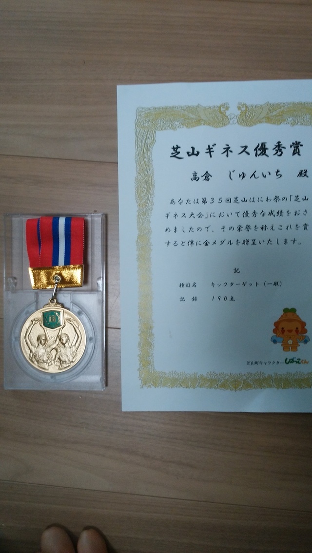 その中で、長男と一緒にキックターゲットに挑戦したのですが、なんと成人の部で優勝してしまいました。